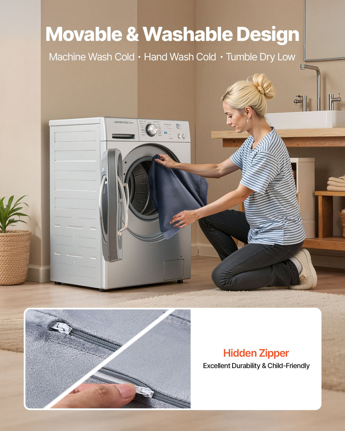 For added security, we use premium child-friendly zippers that are cleverly designed with hidden pulls to avoid kids or pets from accidentally unzipping. The movable slipcover can be easily unzipped and washed by hand or in cold water in the machine