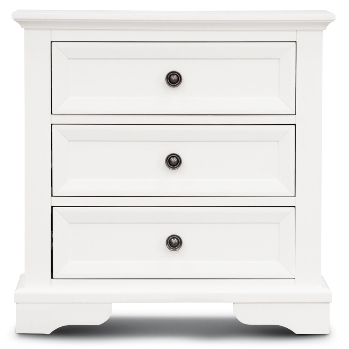 Stop wasting time worrying about where to keep that diary and all that stuff that you need in your bedroom on a regular basis.Bring home a set of 3-drawer bedside tables and solve your bedroom's storage space problem forever. Crafted in the coastal style, the bedside tables complement your bedroom wonderfully. Its drawers have full metal extension runners and shiny, black metal knobs. The top drawer has black felt for the safe storage of delicate items.The bedside table set is made of sustainably harvested solid acacia timber. The wood is known for its good looks, shock-resistance, and durability. The furniture piece in a white painted finish goes well with a variety of interior decor styles, and a one-year warranty is included with the fully-assembled bedside set.