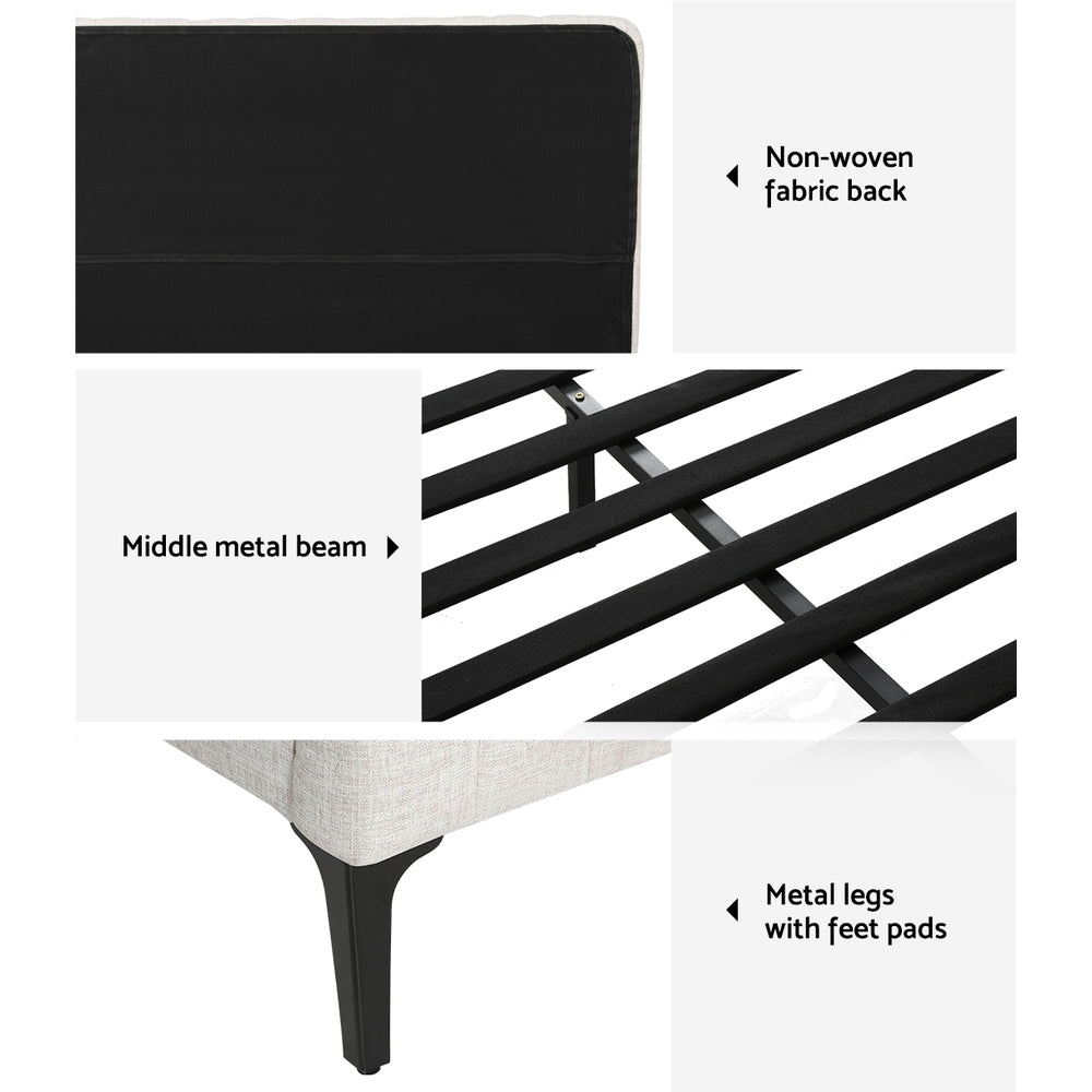 Add a touch of cosiness to your bedroom with our Korra AMMY Bed Frame. Wrapped in premium faux linen fabric, the bed frame is aesthetically pleasing and extremely pleasant and smooth to the touch. The non-woven fabric is incredibly breathable to prevent moisture and bacteria build-up. The gorgeous cream shade enables you to style it in any bedroom, and it'll seamlessly blend into your home decor. The bed frame comes attached with a textured bed head and matching bed foot for a cohesive aesthetic. It has high-density foam padding, which makes it a cosy spot to sit back and relax, watch a movie, or read a book. Furthermore, the wide wooden slatted base provides a sturdy foundation and allows for proper ventilation for a fresh and dry mattress always. This bed frame has premium heavy-duty metal fixings and solid powder-coated steel legs, so you don't have to worry about stability. The bed frame is available in king and queen and fits Australian standard-size mattresses. Experience the sweetest dreams with the Korra AMMY Bed Frame today.