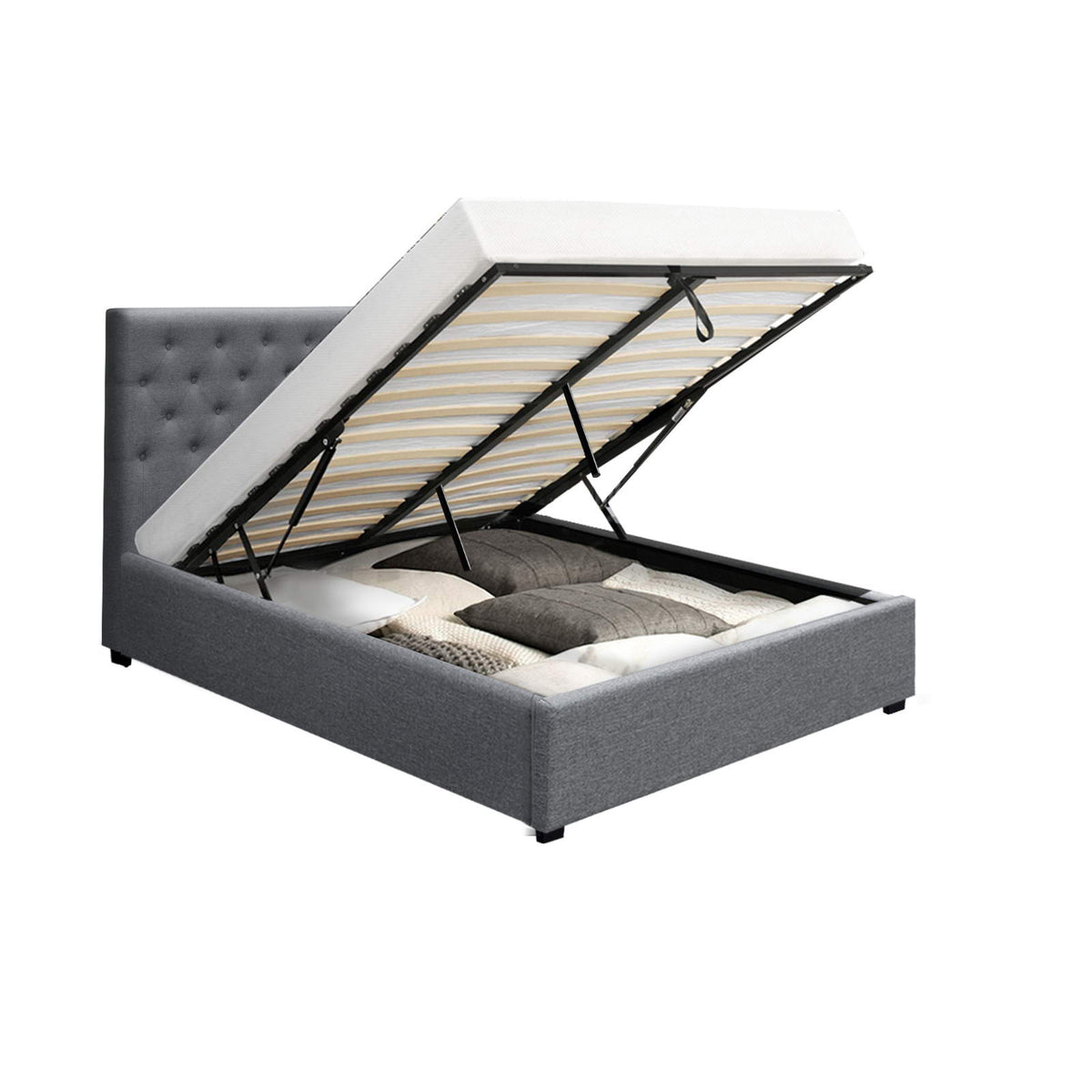 Lift the frame by pulling a strap and you will see a hidden storage space under the wooden arched slat base. The gas lift system enables you to effortlessly lift the bed to store all the items you wish to hide away, and it is perfect for storing seasonal clothes or extra bedding.