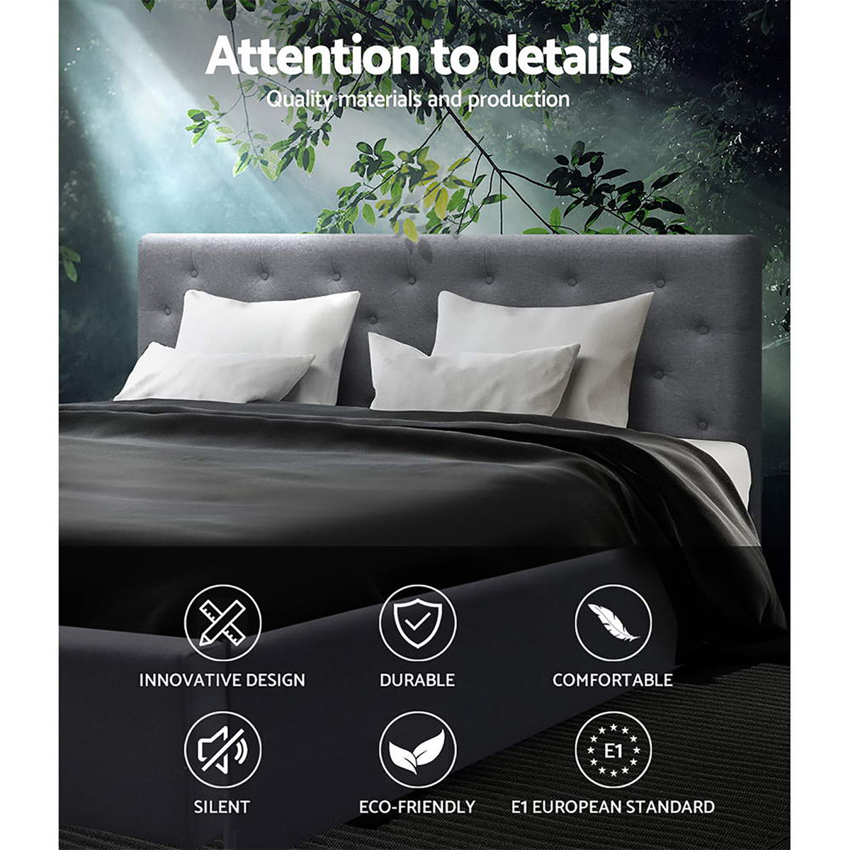 It is time to upgrade and sleep like royalty in our Korra Vila bed frame. Draped in a faux linen fabric, and with a grandiose tufted headboard; you will enjoy retiring to your boudoir and going to sleep each night. But there is a more to this luxurious bed frame than meets the eye!
