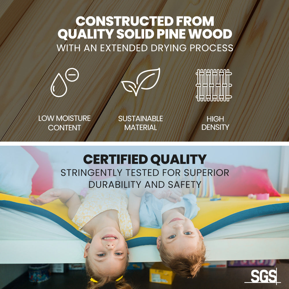 Crafted from solid high-quality sustainably sourced timber and is compatible with standard Australian single and double sized mattresses. Safety is paramount with SGS-certified quality, rigorously tested for superior durability. The bed features durable plywood slats and a solid, secure ladder. It even features an exclusive toy shelf which is sure to be a nice home for their favourites.